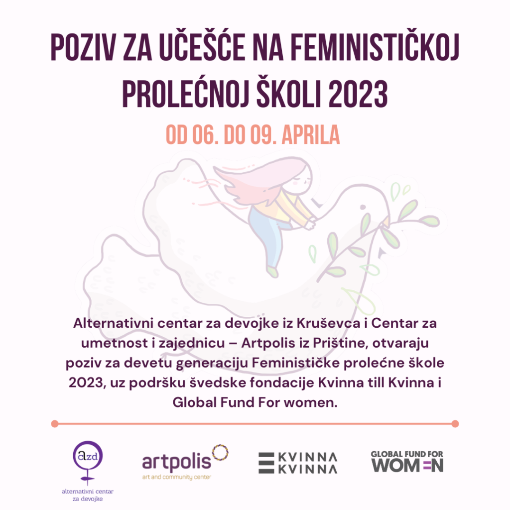 Alternativni centar za devojke iz Kruševca i Centar za umetnost i zajednicu – Artpolis iz Prištine, otvaraju poziv za devetu generaciju Feminističke prolećne škole 2023, uz podršku švedske fondacije The Kvinna till Kvinna Foundation i Global Fund for Women.