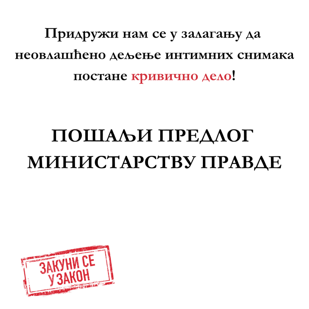 Obaveštavamo javnost da Radna grupa Ministarstva pravde, ni nakon svih naših apela i peticije koju je potpisalo 21.731 građanki i građana, nije predložila donošenje novog krivičnog dela kojim će svaka zloupotreba i neovlašćeno deljenje intimnih snimaka biti krivično delo. Trenutno je u toku javna rasprava vezana za predložene izmene i dopune Krivičnog zakonika koja traje do petka 1.11.2024.g.