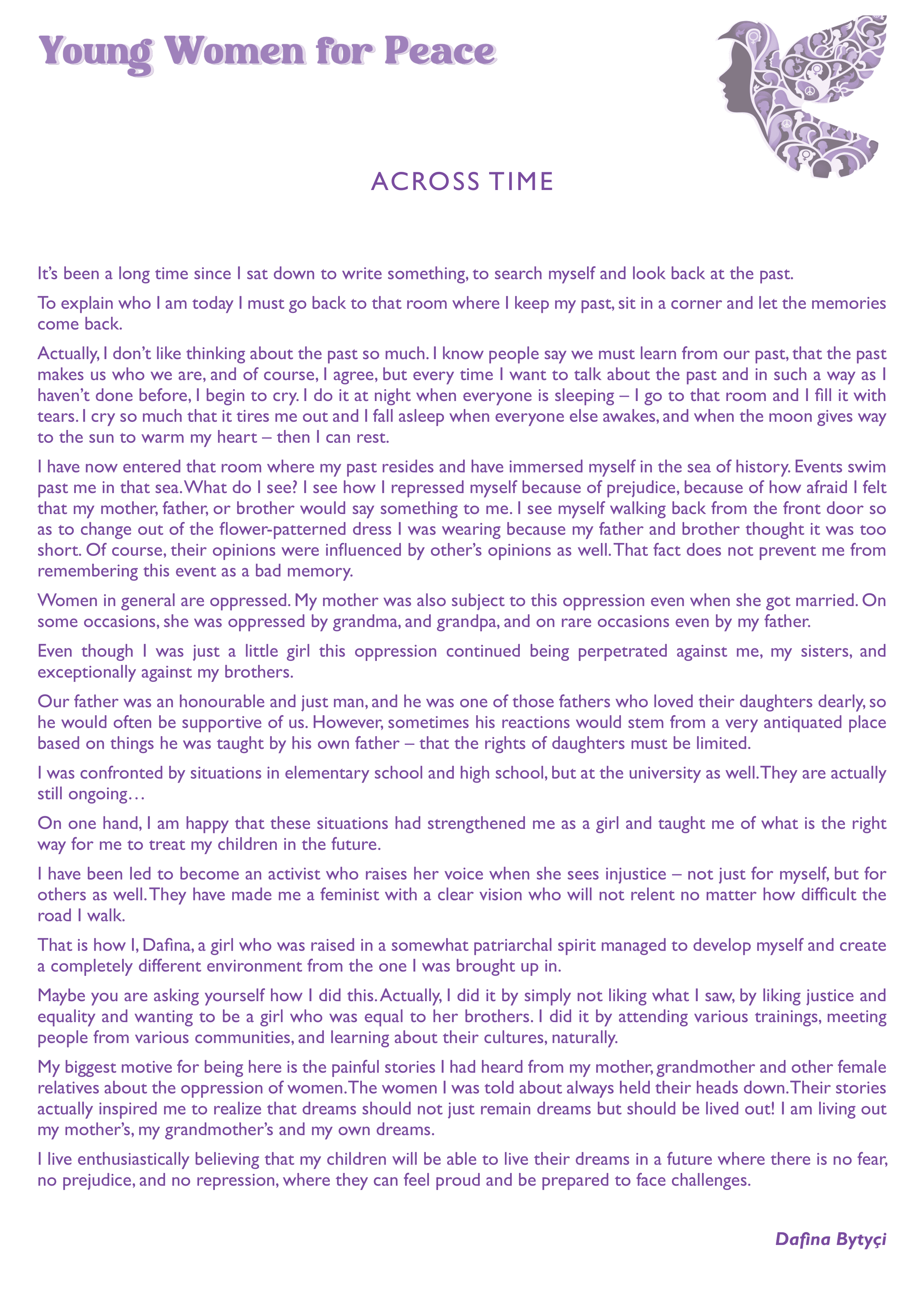 Peacebuilding is based on the individual experiences, values, and principles of those who recognize the purpose of this topic, who tried to prevent wars before they happened, who helped those in need during them, and who built networks of trust, mutual support, and solidarity after them, and the generations born just before, during, or after the wars of the 1990s in the former Yugoslavia grew up to be influenced by the consequences of wars. This is how a feminist approach to peacebuilding was created. Below we present some of the essays by alumnae of the Feminist Spring School, which guide us through what they experienced, felt, and were willing to share. Each essay is presented in three languages, the essays in Albanian and English are below.