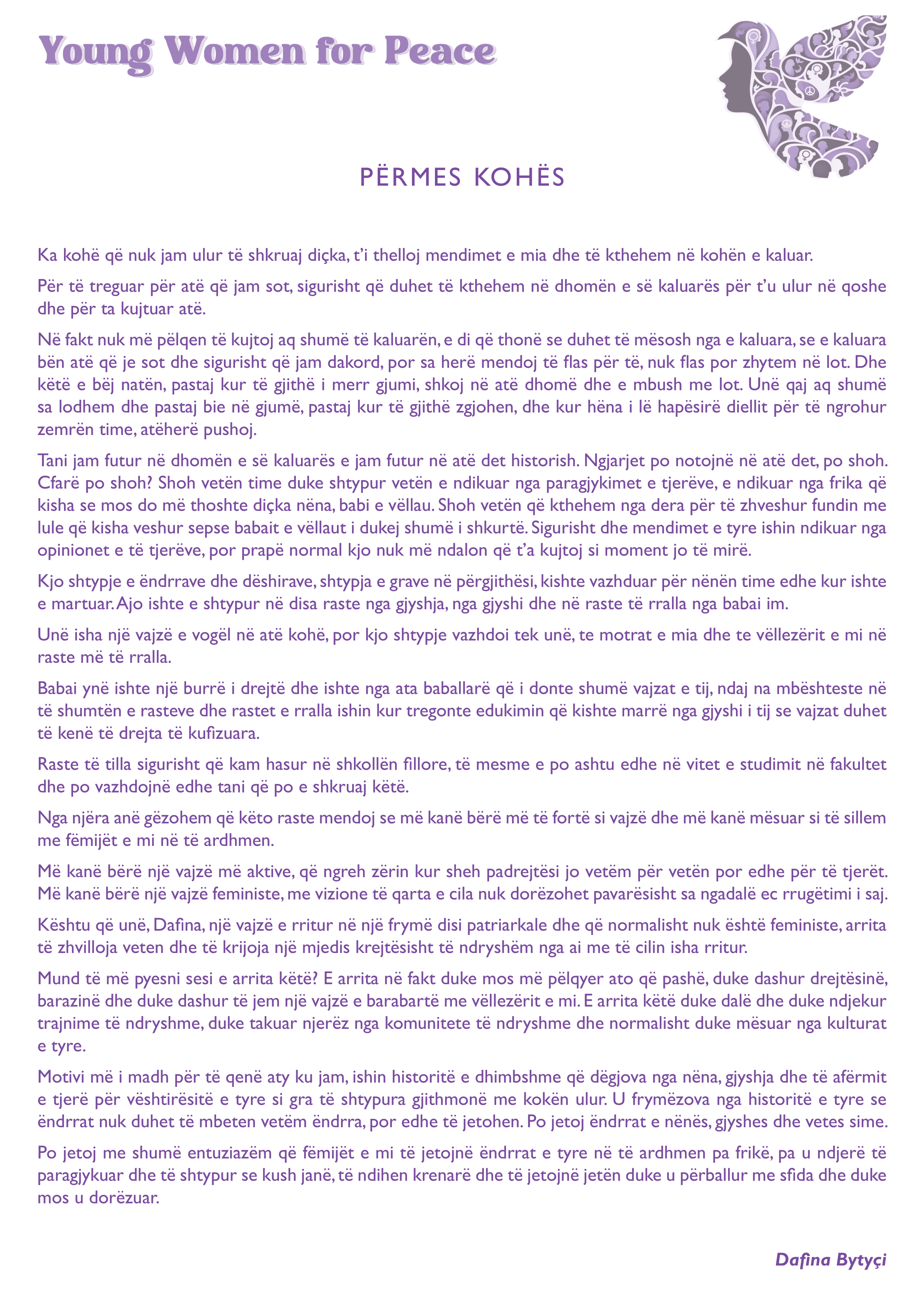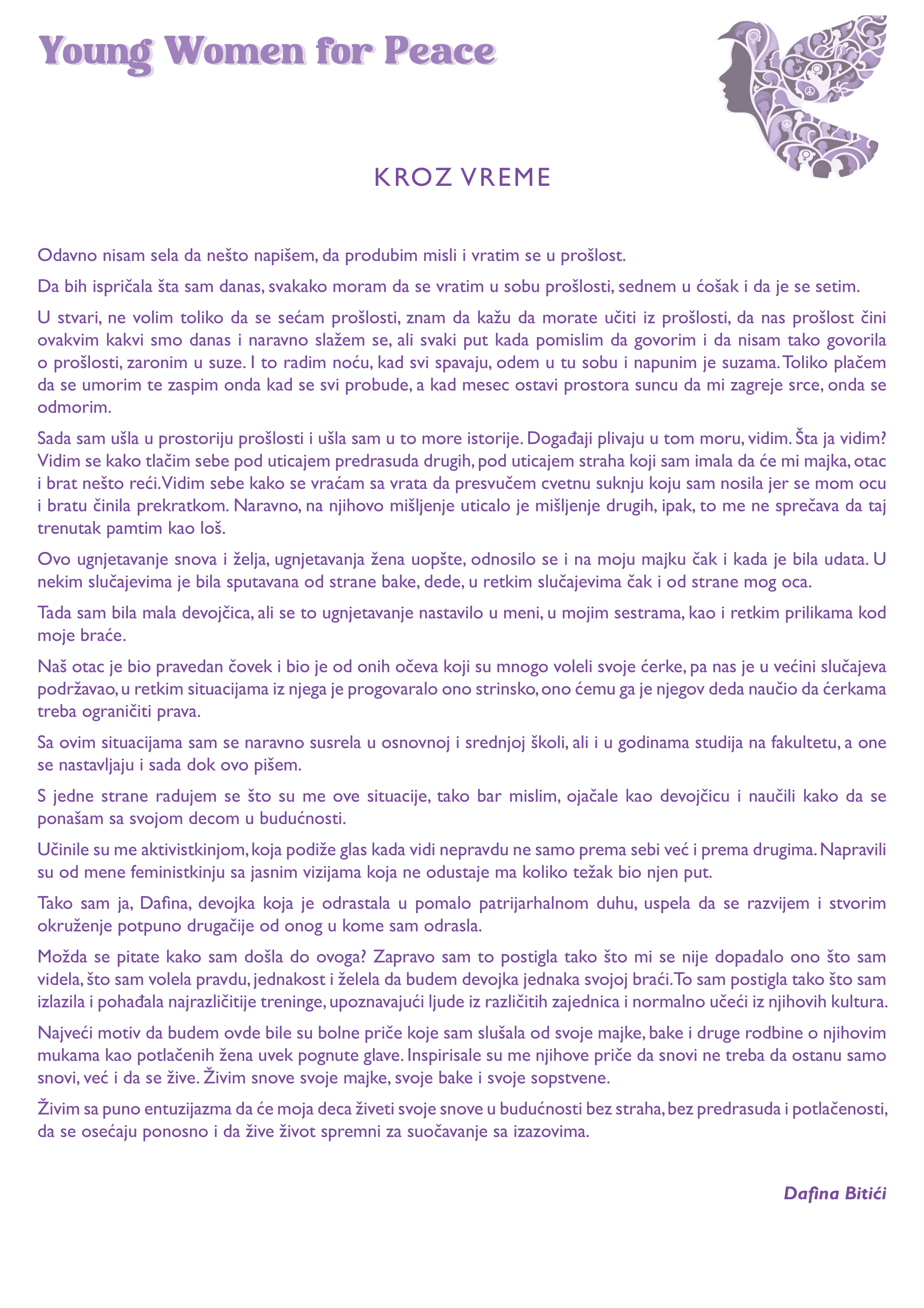 Izgradnja mira počiva na individualnim iskustvima, vrednostima i principima onih – koje u ovoj temi prepoznaju svrhu, koje su pre ratova nastojale da ih spreče, tokom ratova pomagale ugroženima, a nakon njih gradile mreže poverenja, uzajamne podrške i solidarnosti. I generacije koje su se rodile neposredno pre, tokom, ili nakon ratova devedesetih, na području bivše Jugoslavije kroz odrastanje su došle do toga da na njihove živote utiču posledice ratova. Tako je došlo do stvaranja feminističkog pristupa izgradnji mira. U nastavku vam predstavljamo neke od eseja alumnistkinja Feminističke prolećne škole, koji nas vode kroz ono što su doživele, osetile i bile spremne da podele. Svaki esej je predstavljen na tri jezika, eseji na albanskom i engleskom jeziku su u nastavku.