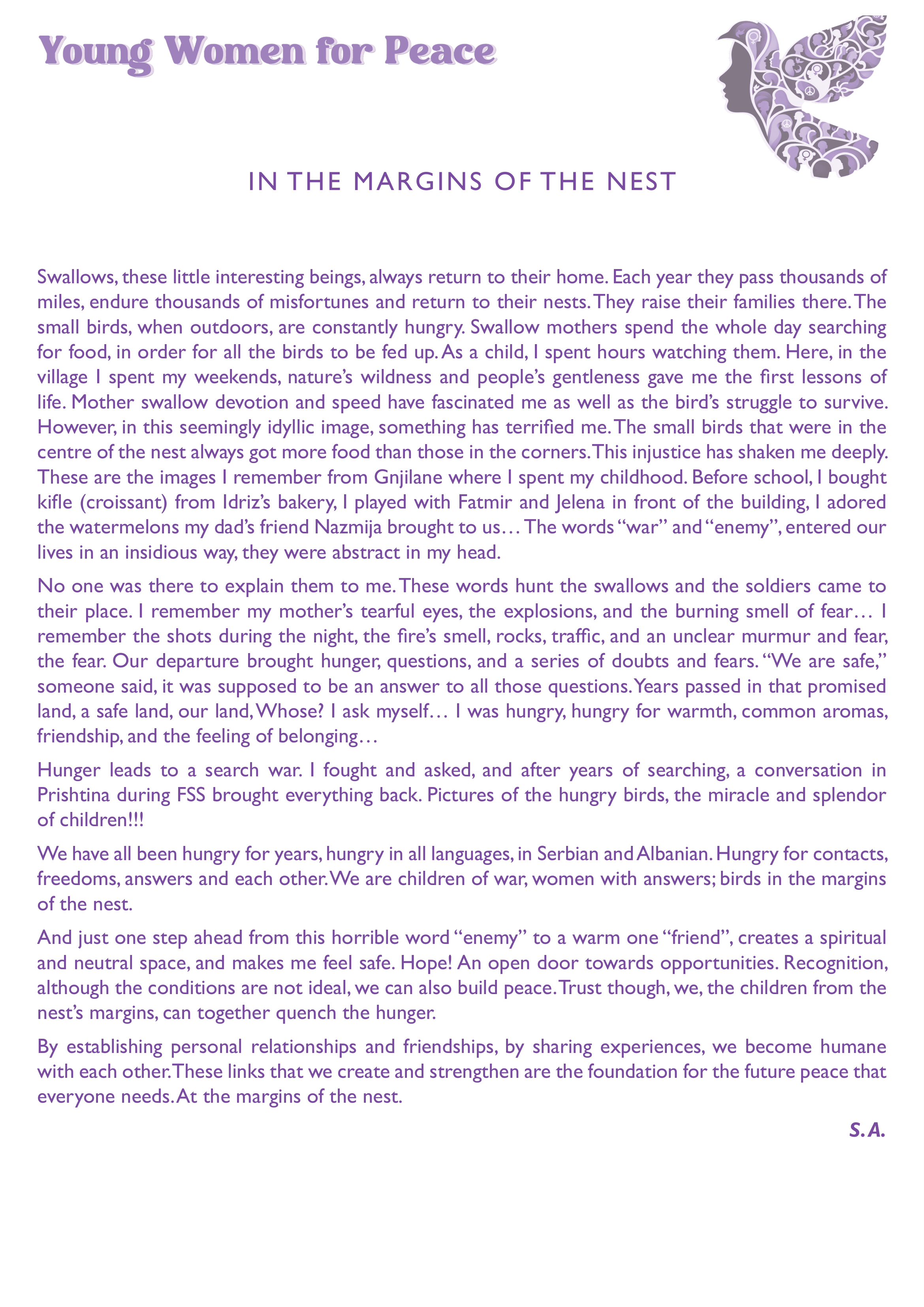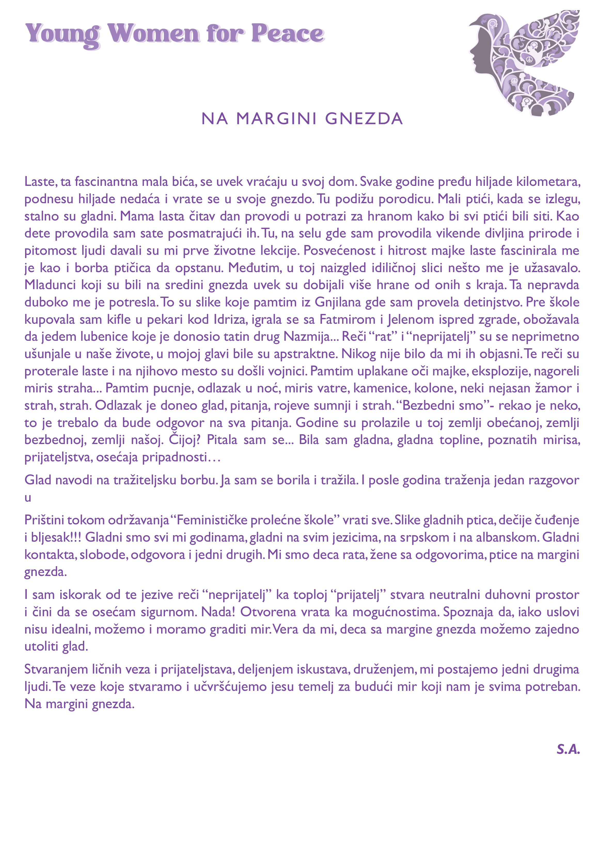 Izgradnja mira počiva na individualnim iskustvima, vrednostima i principima onih – koje u ovoj temi prepoznaju svrhu, koje su pre ratova nastojale da ih spreče, tokom ratova pomagale ugroženima, a nakon njih gradile mreže poverenja, uzajamne podrške i solidarnosti. I generacije koje su se rodile neposredno pre, tokom, ili nakon ratova devedesetih, na području bivše Jugoslavije kroz odrastanje su došle do toga da na njihove živote utiču posledice ratova. Tako je došlo do stvaranja feminističkog pristupa izgradnji mira. U nastavku vam predstavljamo neke od eseja alumnistkinja Feminističke prolećne škole, koji nas vode kroz ono što su doživele, osetile i bile spremne da podele. Svaki esej je predstavljen na tri jezika, eseji na albanskom i engleskom jeziku su u nastavku.