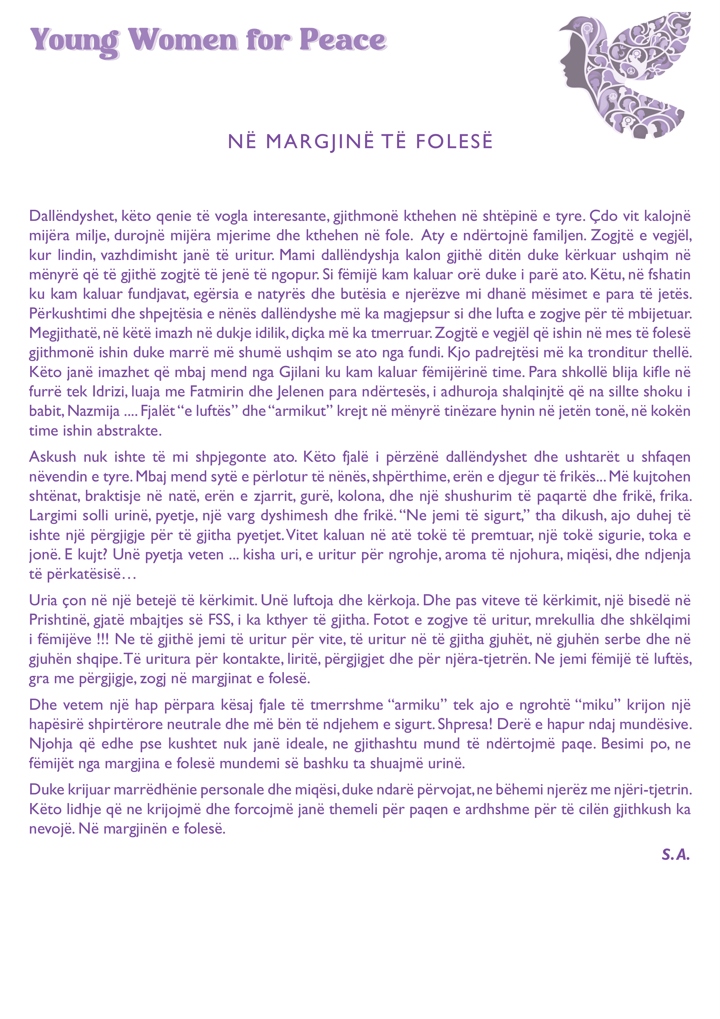 Peacebuilding is based on the individual experiences, values, and principles of those who recognize the purpose of this topic, who tried to prevent wars before they happened, who helped those in need during them, and who built networks of trust, mutual support, and solidarity after them, and the generations born just before, during, or after the wars of the 1990s in the former Yugoslavia grew up to be influenced by the consequences of wars. This is how a feminist approach to peacebuilding was created. Below we present some of the essays by alumnae of the Feminist Spring School, which guide us through what they experienced, felt, and were willing to share. Each essay is presented in three languages, the essays in Albanian and English are below..